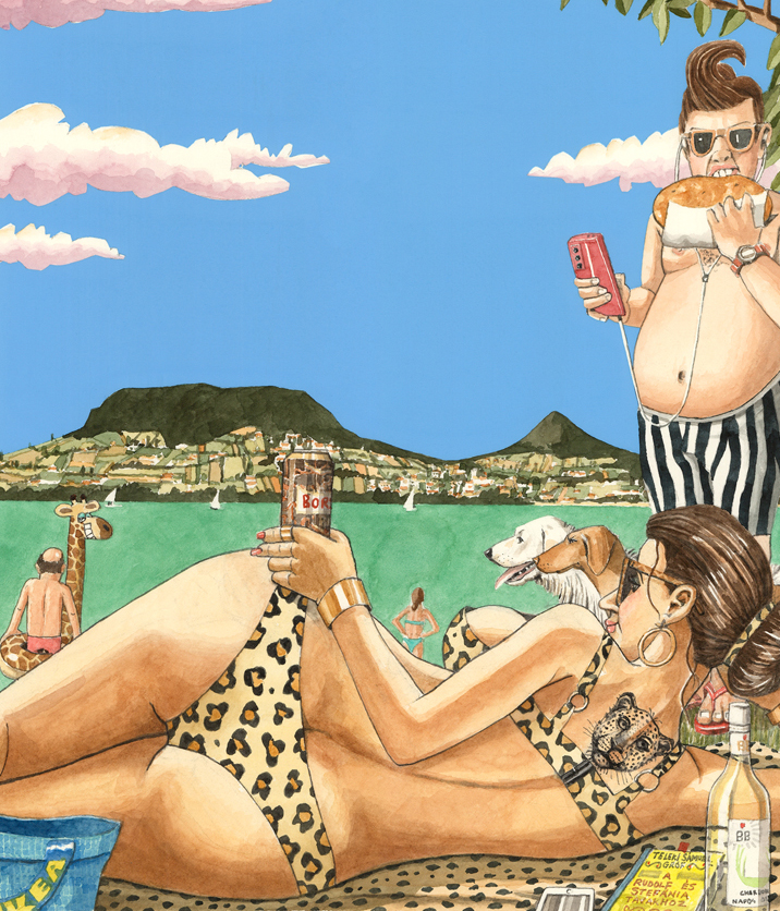 A jó ideje Magyarországon élő Marcus Goldson nemcsak Budapestet, de a Balatont is találóan ragadja meg. Napozók, sörivók, lángossütők, furán lesült családapák és még sokan mások kavarognak összetéveszthetetlen panoptikumában.