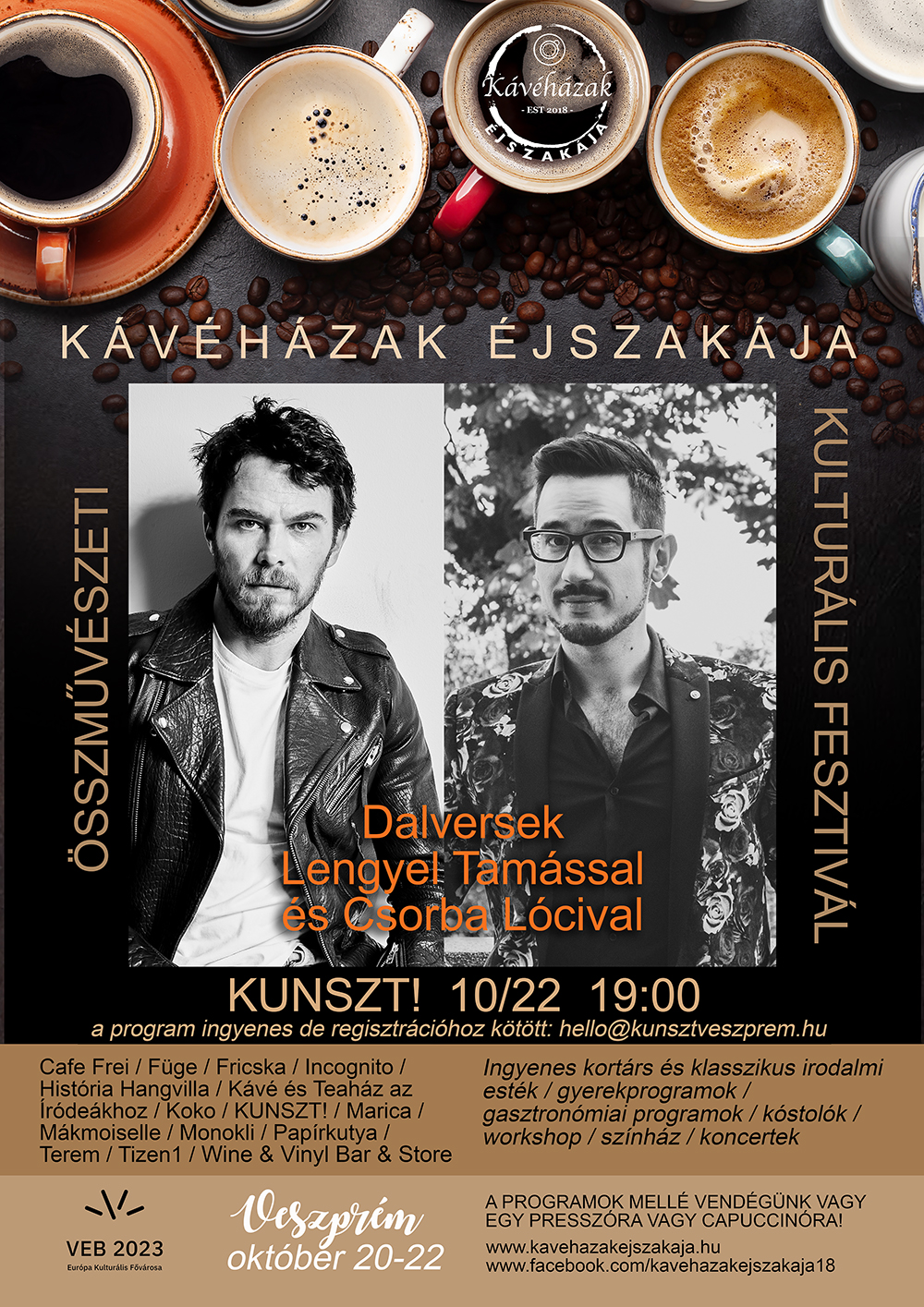 A KUNSZT! és a Kávéházak Éjszakájának létrejöttét a Veszprém-Balaton 2023 Európa Kulturális Fővárosa programnak köszönhetjük.
